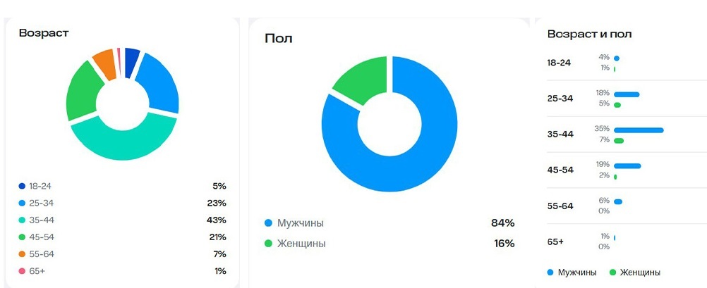 Основу аудитории составляют представители наиболее активных возрастных групп. Лидирует сегмент 35–44 года, который занимает 43% от всех пользователей. Второе место принадлежит группе 25–34 года (23%), третье — возрасту 45–54 года (21%).
